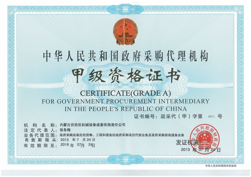 中央投資項目招標代理機構(gòu)甲級資格證書